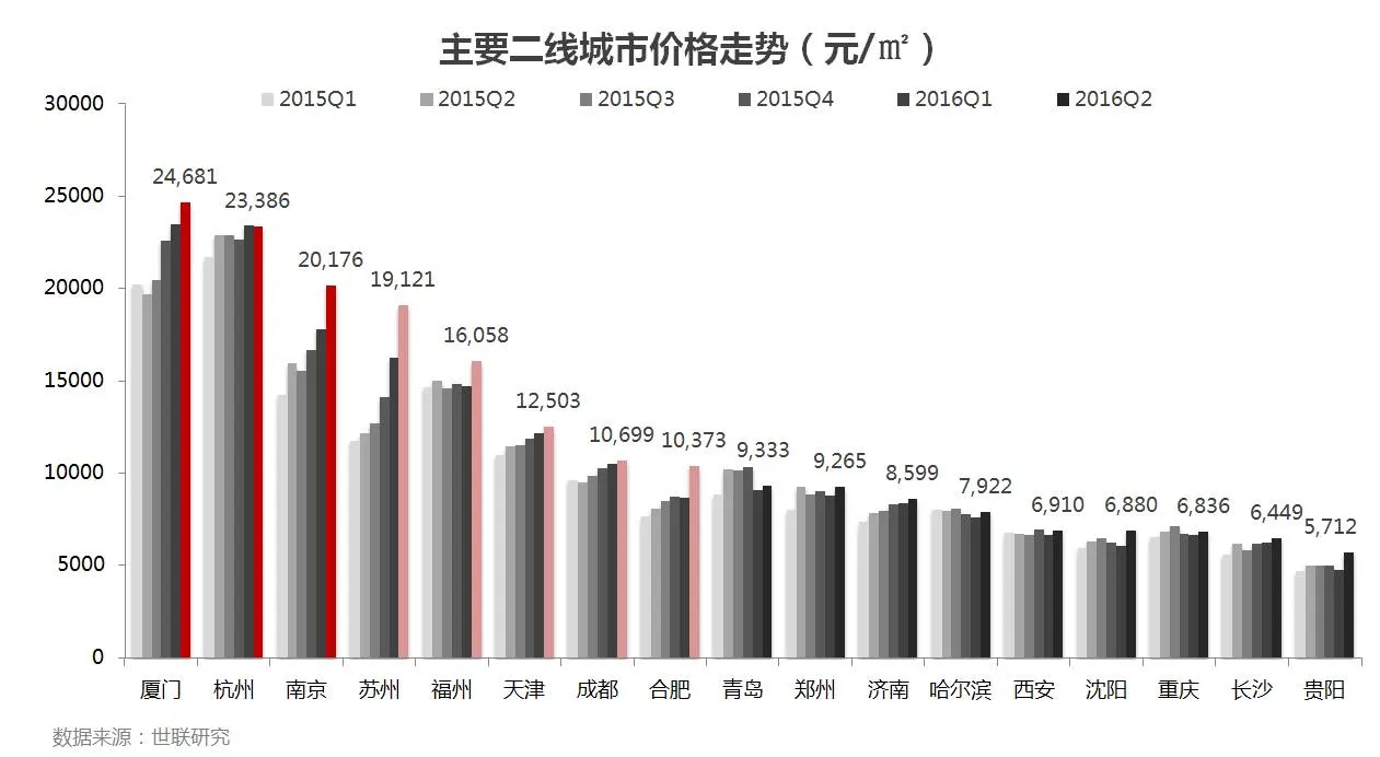 • 从销售价格的角度看来,17个主要二线城市中,厦门、杭州、南京已突破两万,另有5个城市突破万元,其余9个城市仍处于万元以下。