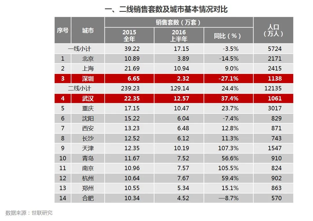 •深圳2015年末常住人口1136万人,武汉1061万人,人口基数相当;而武汉全年销售额是深圳的3倍多,强二线城市将是未来城市化的主力。