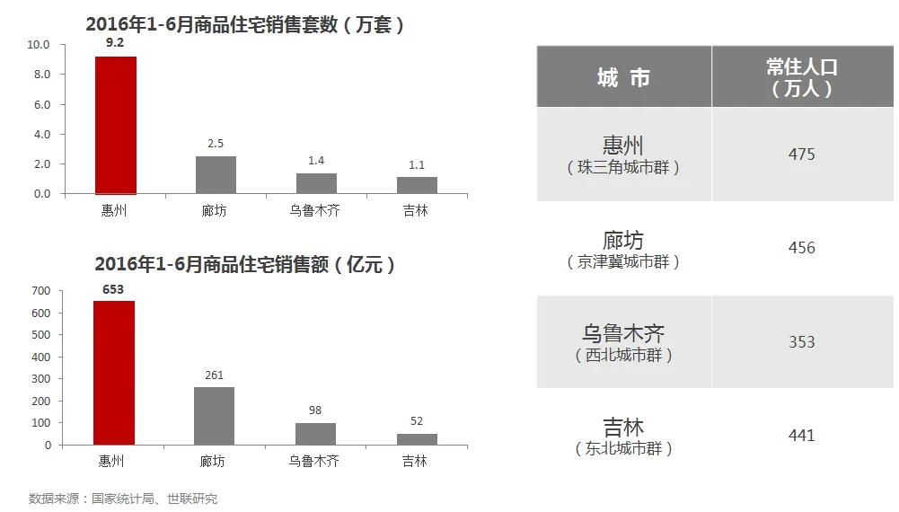 • 2016年1-6月,惠州商品住宅销售套数是吉林市的7倍,廊坊是乌鲁木齐的2倍;