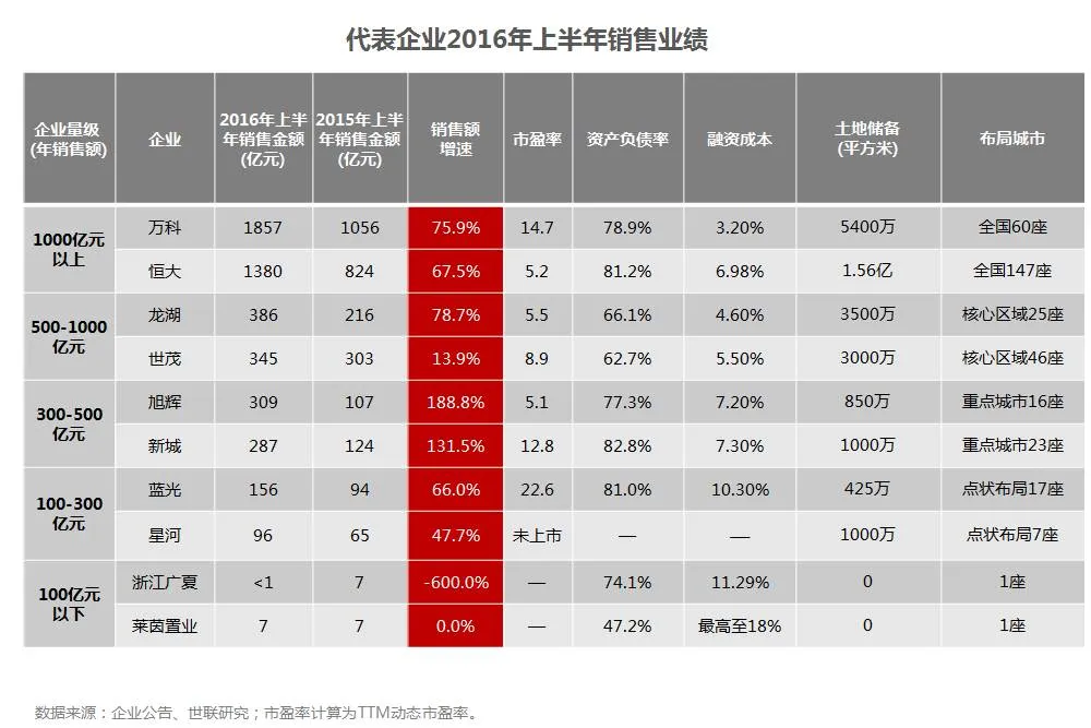 2016年上半年,市场整体持续高温,品牌房企业绩大涨。销售金额排名前100的开发商,总销售金额为22566亿元,同比增长63.47%。