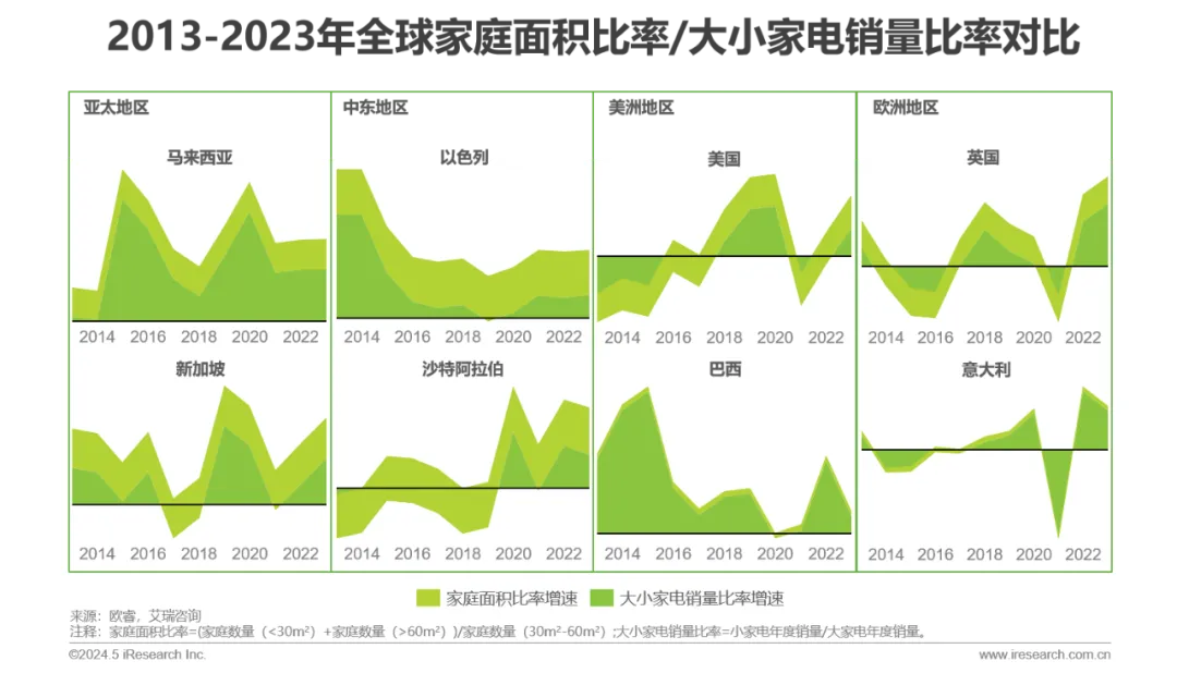 以家庭为单位,考虑到不同国家及区域的家庭住房面积存在较大的差异性,我们选择基本符合常规正态分布的家庭数据作为参考基数,结合小面积家庭及大面积家庭对小家电功能性消费边际均更高的消费决策逻辑。对小家电的潜在边际增长率进行分析,发现在全球范围内,家庭面积的两极化家庭主体,对其结构增量均贡献度较高。以下列举国家区域是全球范围内,较为典型的消费市场。