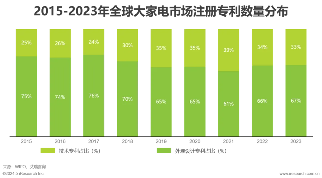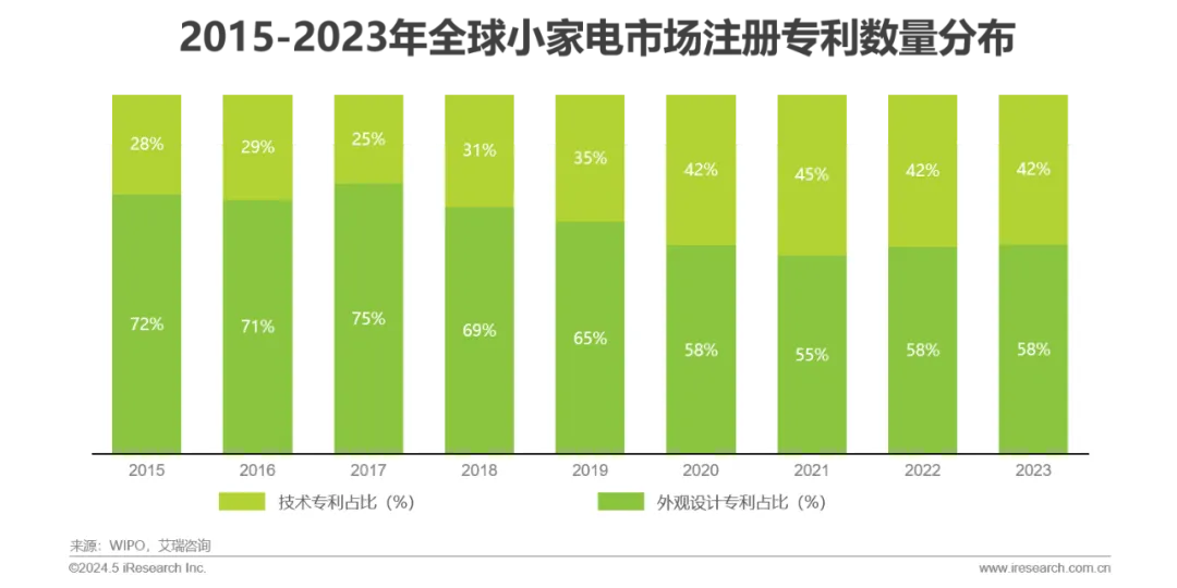 通过分别对比全球大家电/小家电市场的“技术专利”和“外观设计专利”的数量占比,可以发现大家电市场自2010年至今,其技术性专利占比始终保持在23-33%的相对区间。而小家电市场虽然自2010年至2019年,亦区域改范围区间。但是自疫情起始,其技术专利占比快速增长至42-45%的范围。相对而言,我们认为在小家电市场的内卷开始集中在基于“实用功能性”更迭的技术创新。并且,未来来看该因素能够在企业主体层面,帮助其实现有效份额获取,及产品品牌溢价的进一步提升。