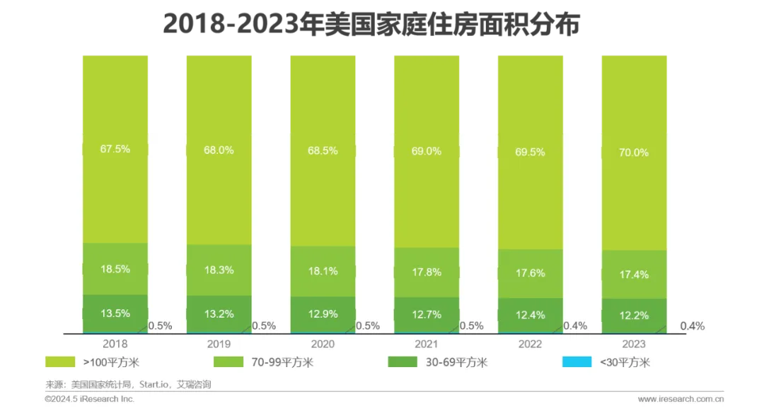 相较美国市场的家庭面积分布集中于高(>100平方米),西欧市场的中等(30-99平方米)面积分布比重更高。对应消费类型增量主要集中在“家庭厨房类”及“个人清护类”为主。同时基于未来5年新购房市场主体的年龄分布,对应家电家居品类的核心群体仍然集中在Z时代年龄群,并未受到长期老龄化趋势的影响。