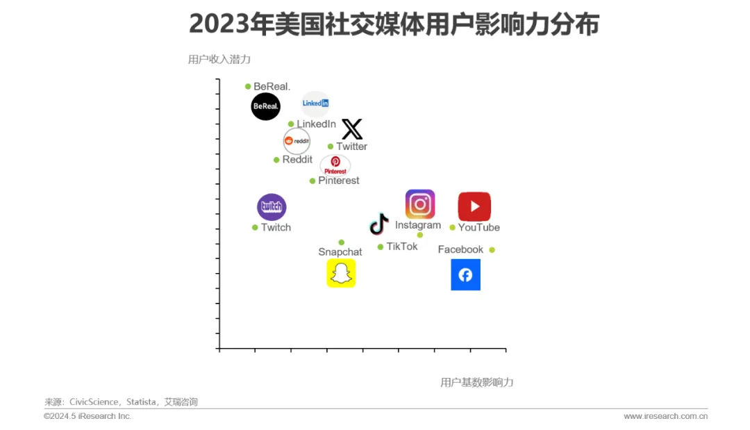 结合上文中对美国消费群体特征的分析,小家电消费的未来潜力主要集中在Z时代群体。同时结合不同社交媒体平台,其不同收入群体的分布(主要分为高、中、低三类群体),以及其相关用户基数影响力,可以发现,头部平台具备更强的营销变现弹性和空间。