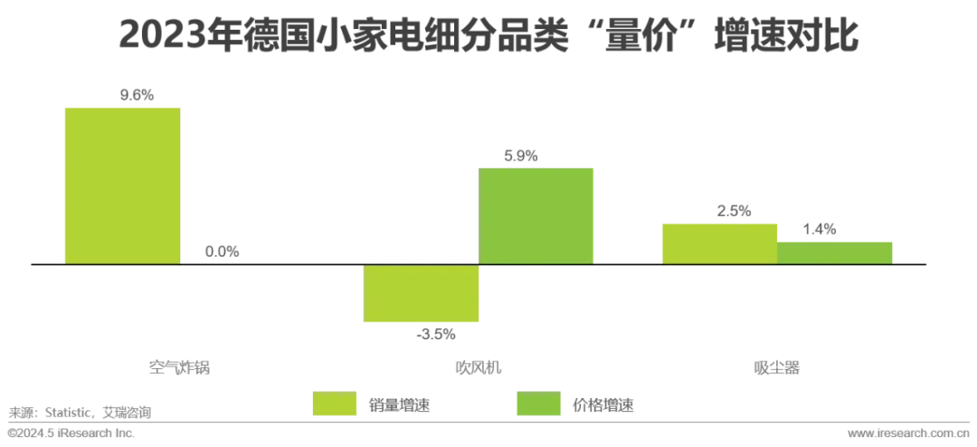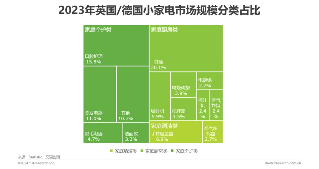 从两个国家的家庭消费习惯来看,共性特征是家庭个护+家庭厨房类具备更大的市场份额。同时空气炸锅作为健康饮食消费的市场增量,在量价两个维度层面均表现较为优异。在更细分的品类上,其实还存在一定差异,诸如英国市场对应的空气净化器品类,具备更强的消费需求。而德国市场对吸尘器类高客单单品具备更强需求弹性。另外,同美国市场类似,吹风机类低客价小单品,销量增速瓶颈明显,但具备更高吃的价格弹性。