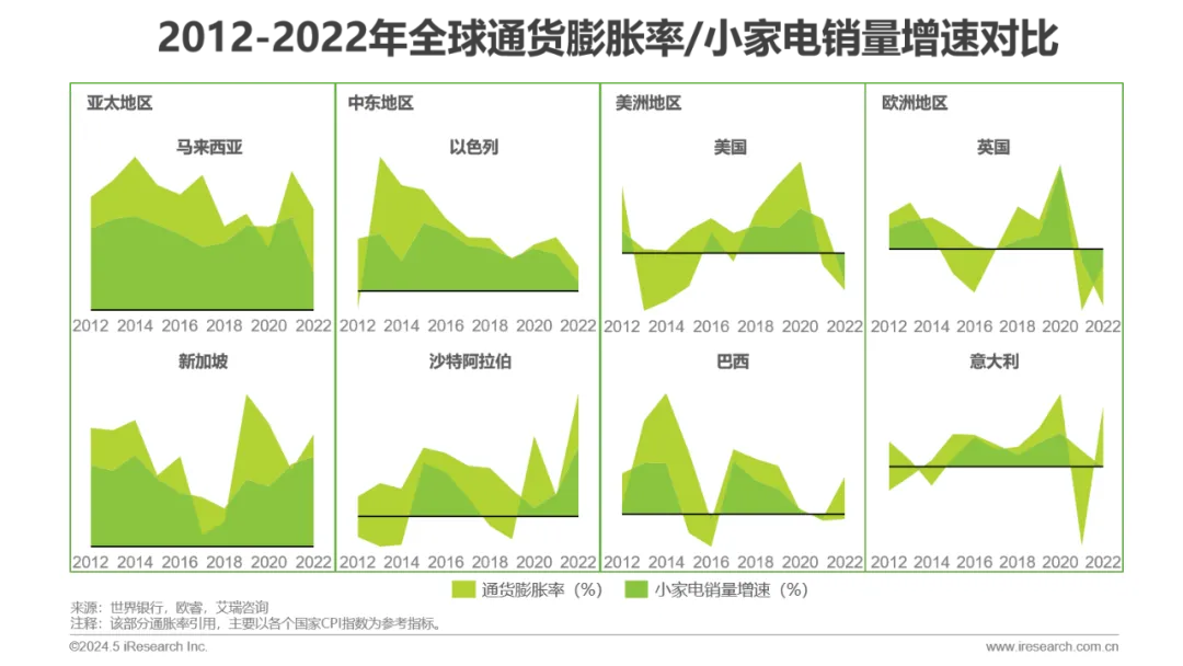 常识研究场景下,高通胀或者通缩背景下,均对耐消品类消费需求产生一定程度的消极影响。我们通过全球不同区域国家的在通胀率影响下的小家电增速变化,可以发现,虽然小家电品类亦会受到通胀率影响,但是在大部分时间周期内,需求基数相对稳定。