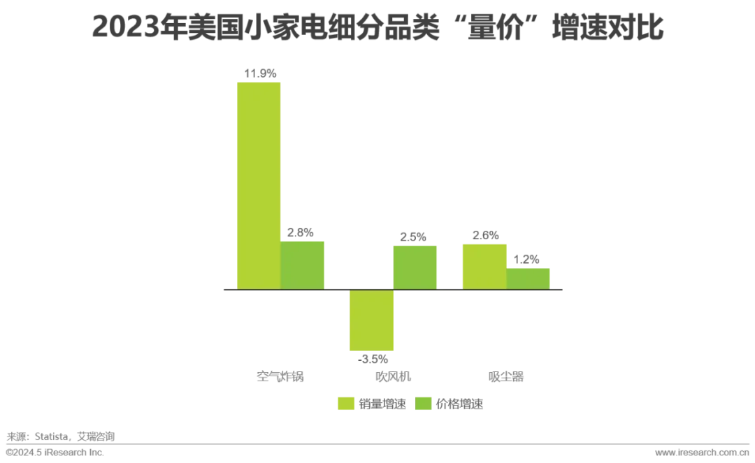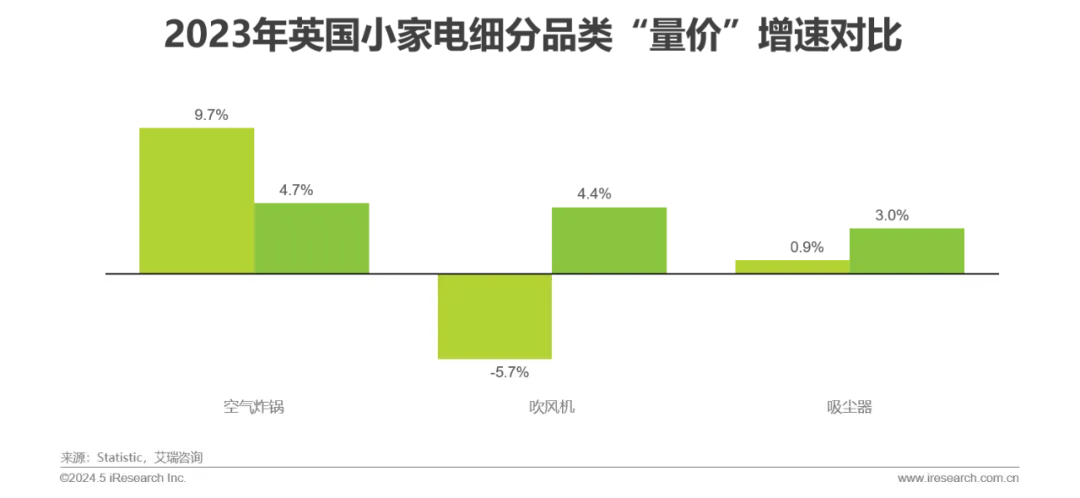 从两个国家的家庭消费习惯来看,共性特征是家庭个护+家庭厨房类具备更大的市场份额。同时空气炸锅作为健康饮食消费的市场增量,在量价两个维度层面均表现较为优异。在更细分的品类上,其实还存在一定差异,诸如英国市场对应的空气净化器品类,具备更强的消费需求。而德国市场对吸尘器类高客单单品具备更强需求弹性。另外,同美国市场类似,吹风机类低客价小单品,销量增速瓶颈明显,但具备更高吃的价格弹性。