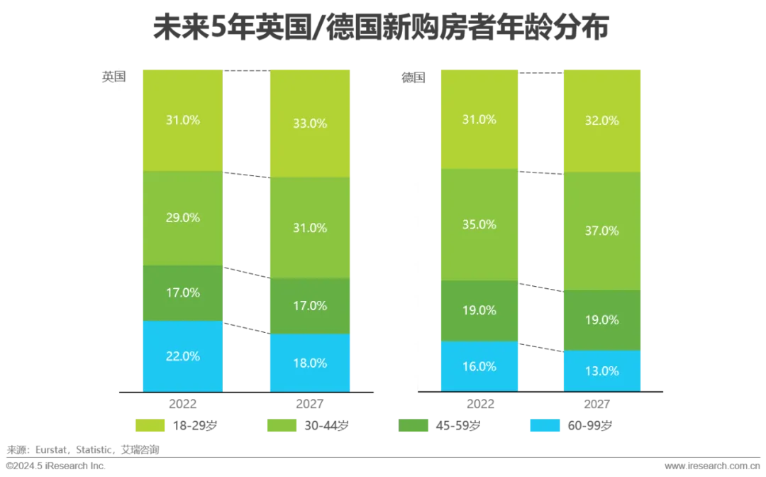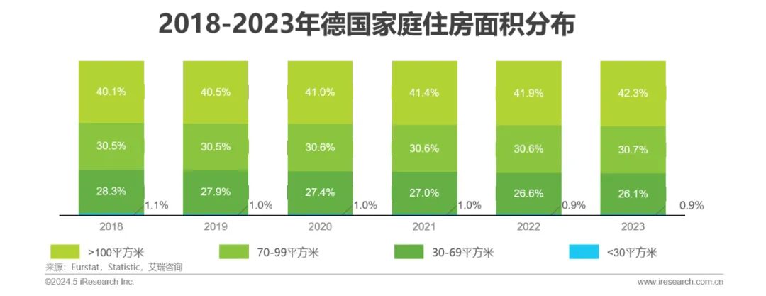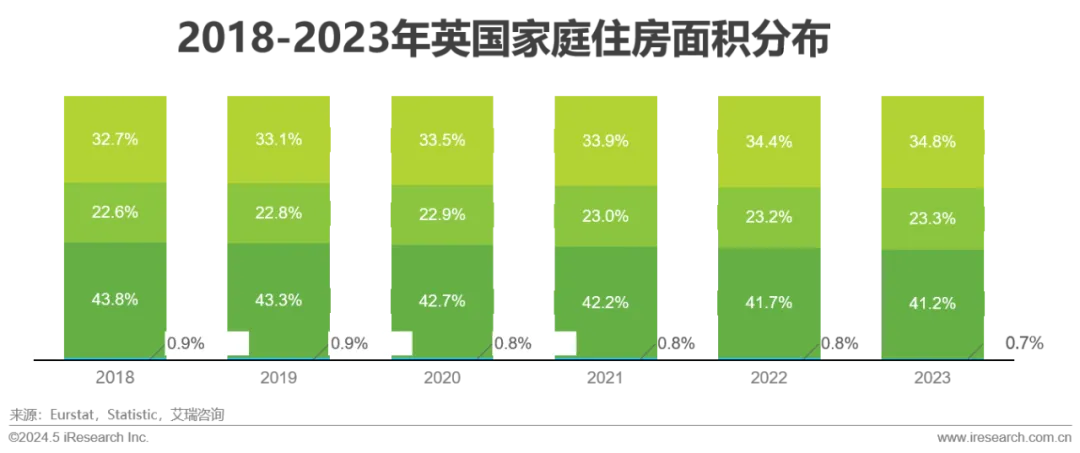 相较美国市场的家庭面积分布集中于高(>100平方米),西欧市场的中等(30-99平方米)面积分布比重更高。对应消费类型增量主要集中在“家庭厨房类”及“个人清护类”为主。同时基于未来5年新购房市场主体的年龄分布,对应家电家居品类的核心群体仍然集中在Z时代年龄群,并未受到长期老龄化趋势的影响。
