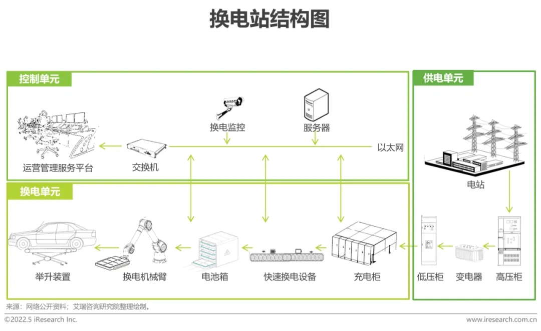 换电站主要包含定位系统、换电系统、运维系统、安全系统和物流系统。其中换电系统是换电站的核心,由换电平台、码垛机、升降机构、锁止机构、连接器等组成;控制系统包括:充换电云平台系统、智能站控系统、配电监控系统、烟雾/安保监控系统等;供电系统:高压电柜、变压器、低压电柜等。
