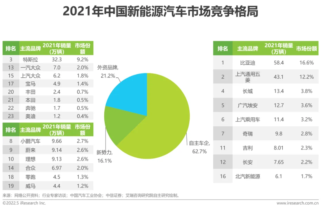 2021年,中国新能源汽车市场集中度进一步提高,头部效应凸显,比亚迪市占率最高,达16.6%。其次是上汽通用五菱、特斯拉中国、长城、广汽埃安、奇瑞、小鹏、蔚来、理想等,CR10市场份额达60%,较2020年增长10%。