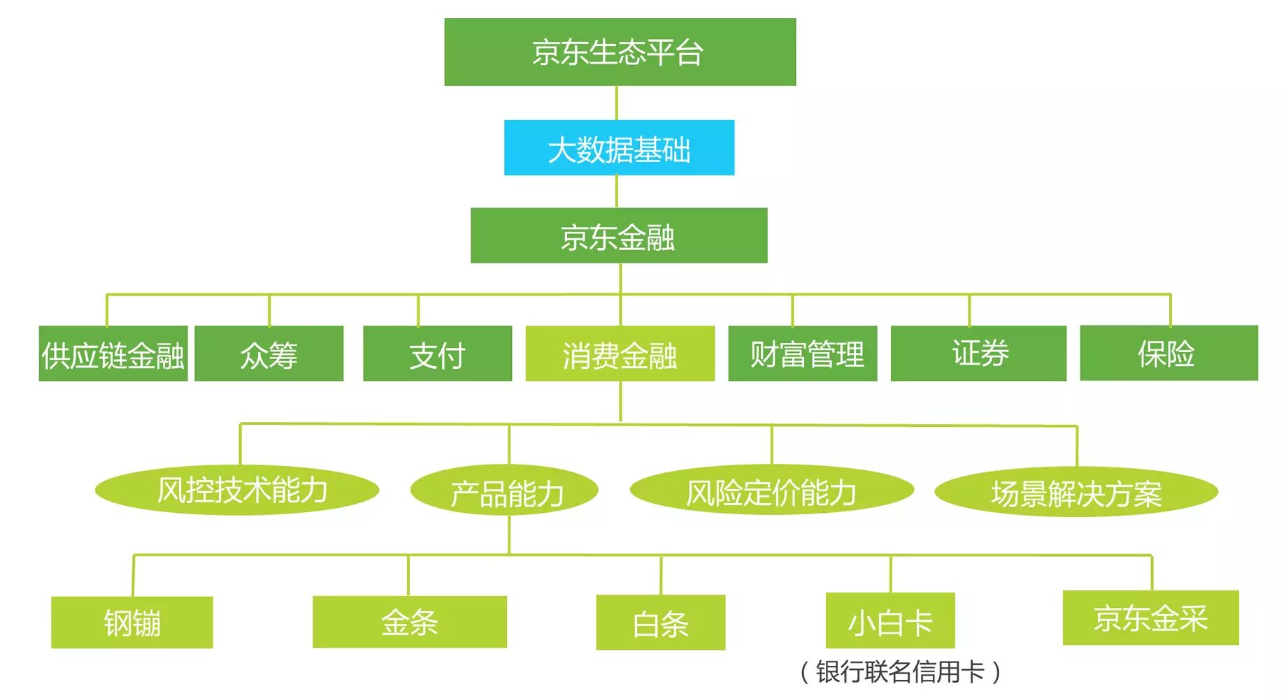 京东金融基于京东多年来积累的交易数据,物流数据和仓储数据为基础的金融科技平台之上,目前已形成了支付、供应链金融、消费金融、众筹、财富管理、保险、证券七大业务板块。目前,其消费金融业务已经拓展到京东体系外,通过输出风控和风险定价能力,为更多的线下消费场景提供产品、服务、资金融通解决方案,服务用户消费升级、财富增值以及企业资金管理等新生需求,助力创业创新,促进了中国实体经济发展和结构转型。