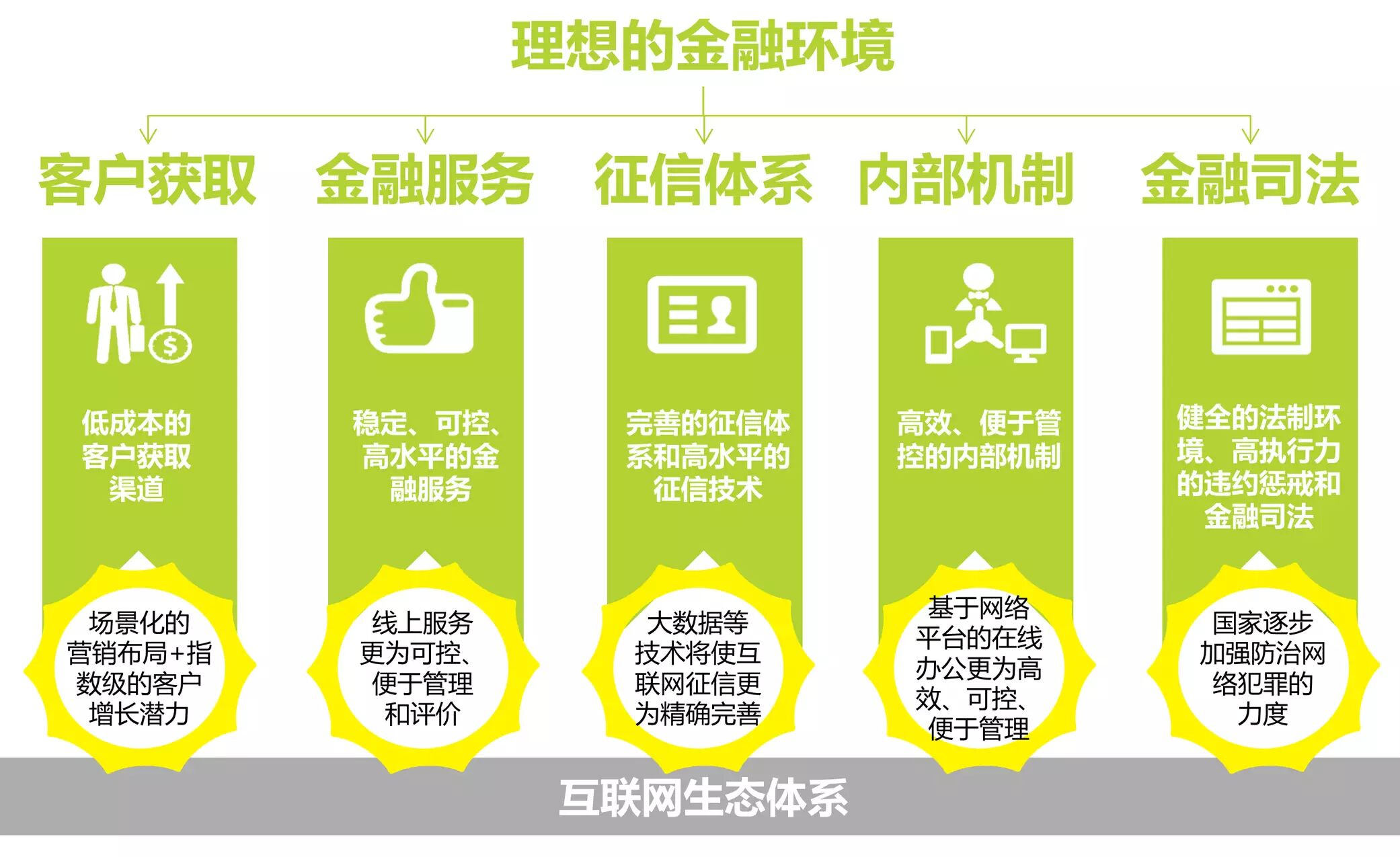 互联网改变了信息传播的方式,同时也影响了目标客户的获得手段;互联网技术的发展使得金融领域的运作更加规范和透明,同时也使得网络征信体系日益完善。金融行业在现实中发展的种种瓶颈很多都能在与互联网生态的结合共进中得以解决。