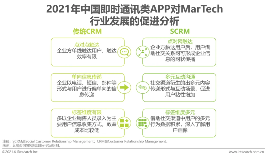 虽然移动互联网时代的快速崛起给中国MarTech服务商的发展带来了一定难度,但同时也为中国MarTech服务商探索移动互联网环境下MarTech服务的发展方向提供了成熟的土壤。例如,在移动互联网的发展推动下,即时通讯类APP显现出突出的大规模、高粘性用户特征,为中国MarTech服务商打造如SCRM等依赖社交渠道的产品带来优势。(1)社交渠道所带来的用户社交关系网,能够帮助企业将点对点用户触达模式,转变为通过SCRM开展的点对网高效触达模式;(2)社交渠道中的多元内容传递形式与互动场景,帮助企业对用户开展多元互动沟通,促进用户粘性的提升;(3)社交渠道中的多维度用户行为数据积累,则能够使企业更加深入、多面地了解用户,实现对用户的精准触达与运营。