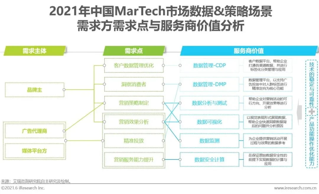 数据与策略场景将数据分析与测试、管理、可视化呈现、监测及安全计算等服务涵盖在内,其职能和服务贯通需求方营销活动开展前、中、后的全链路。数据与策略场景的核心需求方主要分为品牌主、广告代理商、媒体平台方,其中,广告代理商和媒体平台的需求核心围绕着更好地实现营销服务而展开,品牌主的需求则主要覆盖客户数据管理、营销活动制定及效果分析等。(1)因该场景最贴近于对数据的处理,服务商技术的稳定和可靠性以及对数据安全的保障能力尤为重要,也成为其提供产品与服务的基石。(2)数据与策略场景可为其他MarTech场景服务的开展奠定基础,如何优化产品操作、提升产品使用友好度以让需求方清晰了解产品对痛点的解决能力并快速布局,则是服务商开展服务的砖石与重要抓手。