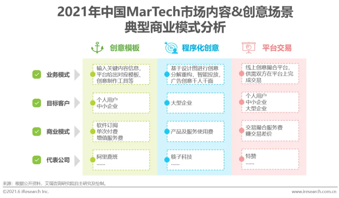 现如今流量竞争激烈,行业对广告内容的数量和质量都提出更高要求。目前,在内容和创意场景下,MarTech营销服务商主要通过创意模板、程序化创意平台、创意及内容交易平台等三种模式为企业需求方提供差异化的内容和创意服务。其中,1)程序化创意平台相较其他两者更适合高客单价客户,多以月度或年度服务费形式合作;2)创意模板类收费较低,适用于个人或小企业主,主要商业模式包括软件订阅费和单次付费等;3)平台交易类则主要通过撮合交易赚取服务费或差价。