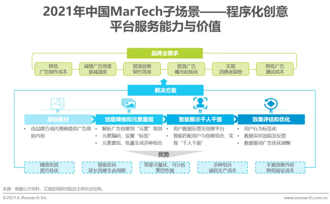 程序化创意平台是一种由数据和算法驱动的能够实现“千人千面”的智能营销服务,其能够将广告各内容元素(如产品信息、文案、配色、图形、声音、人物等)进行分解与重组,并根据广告渠道、目标受众等情况进行优化投放。对于品牌主和营销服务商来说,通过程序化创意平台,能够在同样营销成本下,为增强广告曝光提供更多创意内容,以及延长内容创意的生命周期,并通过数据优化广告内容,提高流量转化率,降低营销成本。
