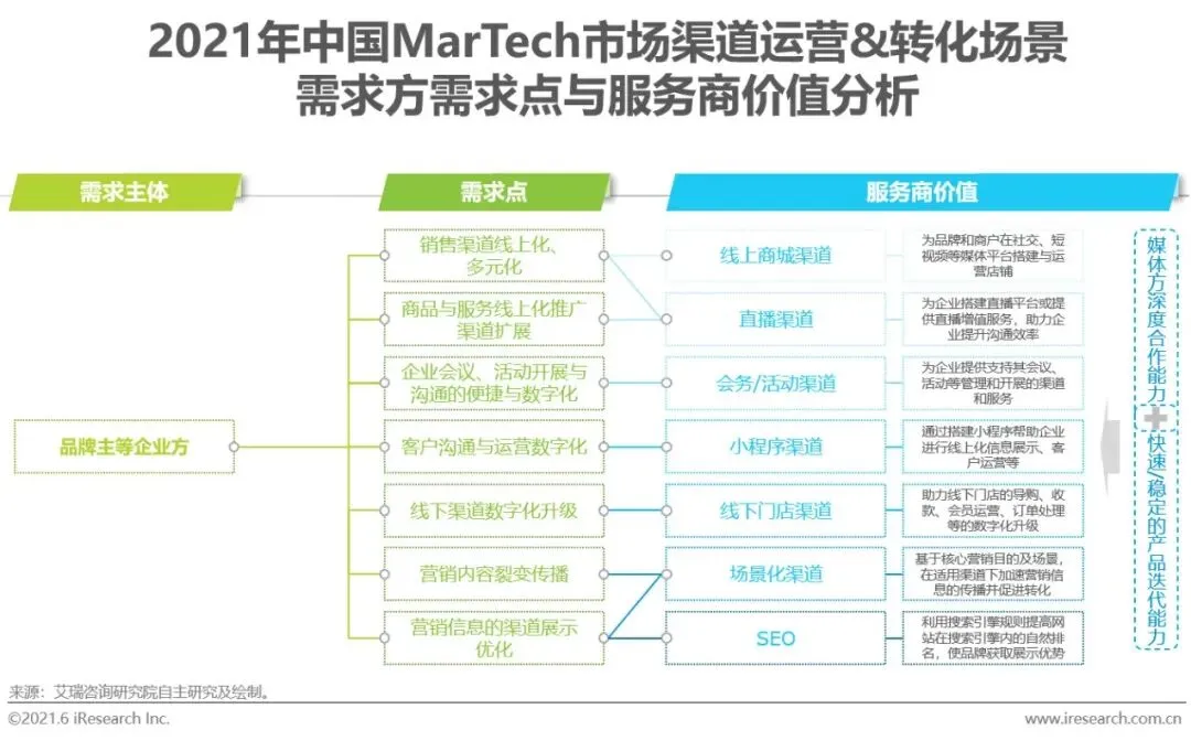 在渠道运营与转化场景中,如品牌主、商家等需求方的需求多集中于将商品和服务的展示、销售和运营渠道进行数字化升级。而对于渠道运营与转化场景的服务商来说,(1)由于渠道多嫁接于媒体平台之上,服务商的媒体资源扩展与链接能力对其在与媒体达成合作后深入洞察媒体的功能、适用营销玩法等具有助益,便于服务商实现需求方的渠道数字化升级需求;(2)同时,借助快速且稳定的产品迭代能力,使产品新功能与解决方案先于客户痛点的出现而成型,从被动跟随客户需求转变为引导客户需求的走向,则是服务商提升客户维系能力的关键。