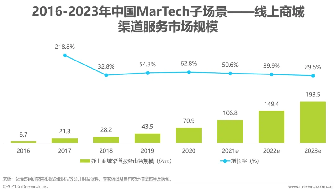 不论是已拥有较为丰富电商店铺运营经验的品牌,或是销售渠道线上化程度尚低的中小商家,线上商城渠道服务商都能够通过搭建与运营线上商城,从渠道扩展、成本优化和用户培育方面为其带来价值。尤其在近年间,互联网流量红利减弱,电商平台优质广告位资源供给量的增长不及品牌和商户营销需求增长快速的现象显现,线上商城渠道服务成为品牌和商户寻找低成本销售渠道、增强用户粘性、扩大用户基础的有效路径,进而也推动着服务商收入规模从2016年的6.7亿元快速增长至2020年的70.9亿元,并预计将在2023年接近200亿元。