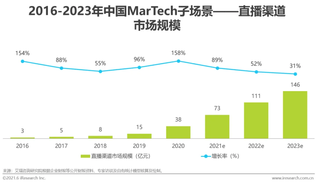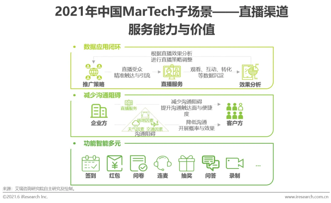 随着通信技术的升级,网络接连的速率、稳定性得以提升,延迟度也在不断降低,为服务商开展直播渠道服务提供了良好的技术环境支持,推动直播渠道服务价值向企业需求方的传递,直播渠道服务商的收入规模也在2020年达到约38亿元。首先,直播渠道可以帮助企业沉淀与收集直播过程中的观看、互动、转化等数据,以赋能企业对直播效果的分析、直播推广策略的优化,以及直播受众的精准引流。同时,线上直播渠道削弱了如场地、天气、交通等因素对企业与客户间沟通的阻碍与影响,助力企业与更多客户便捷地开展沟通,提升客户粘性。另外,直播渠道所能提供的直播辅助功能丰富,使企业拥有多元、智能的管理和互动工具。