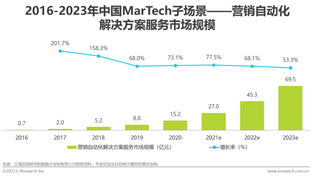 营销自动化能够结合多场景,形成以自动化手段帮助企业洞察与运营用户生命周期,并最终促进用户价值提升的解决方案,其与SCRM等的结合是当前市场中较为主流的应用方向。营销自动化解决方案能够为两类企业带来尤为显著的价值,(1)第一类为以零售业态为代表的产品复购属性突出的企业,营销自动化解决方案基于对用户偏好的洞察,为其在不同时期与渠道下推送个性化内容,加强用户粘性、提升复购频率;(2)第二类为以汽车、房地产行业为代表的用户购买决策周期较长的企业,营销自动化解决方案帮助企业汇集用户生命周期数据与深度洞察用户需求,提升用户在每个决策环节间的转化效率,并最终促成购买转化。营销自动化解决方案推动企业从数字化向自动化营销阶段迈进,2020年,营销自动化解决方案市场规模为15.2亿,随着企业对营销自动化技术认知度的不断提升,服务商也将拥有更大的变现空间。