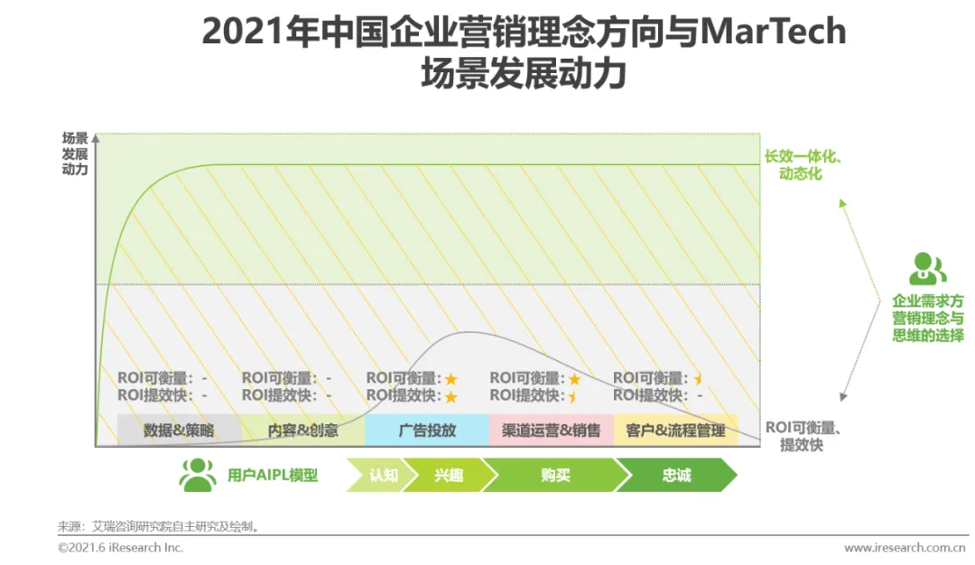 企业需求方的营销理念与思维选择将持续影响着MarTech五大场景的发展动力。广告投放、渠道运营&销售场景对应着用户AIPL模型中的兴趣与购买环节,在其间,兴趣转化和购买转化的ROI具有着较明显的衡量指标,且投入与产出间的链路较短,因而在企业需求方的营销理念更多偏向“投入即产出、产出可衡量”时,该两个场景将具有更大的发展动力。而当企业需求方的营销理念更多偏向长效一体化、动态化,将MarTech各场景看作相互支撑、连通的生态时,不论是广告投放、渠道运营&销售场景,亦或是作为各场景数智化运作基础的数据&策略场景、作为触达用户重要载体的内容&创意场景、作为长期维持用户粘性的客户&流程管理场景,都将具有同样强劲的发展动力。