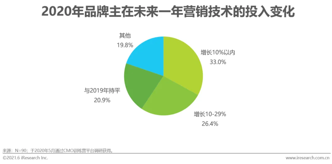 企业需求方内部数据管理能力的偏低,是限制MarTech服务商广泛开展业务与提升盈利能力的原因之一。伴随着企业需求方,尤其是数量庞大、作为国民经济重要支柱的中小微企业数字化升级的推进,企业方对数据的有序、高效、数字化管理将使得更多MarTech服务的开展成为可能,便于MarTech服务商提升企业对接效率。同时,根据艾瑞调研结果,约60%的品牌主都将增加对营销技术的投入作为未来的营销规划,这也推动着品牌主对MarTech服务和产品需求的提升。企业需求方数字化转型的持续推进与对MarTech相关投入的加大,同时夯实与提升了企业需求方实现MarTech服务的基础与需求,并将带动我国MarTech服务商盈利能力的不断加强。
