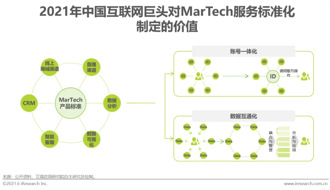 如今中国逐渐迎来了全域精细化营销时代,在激烈的流量和商业竞争环境下,企业的营销需求日益多元,覆盖获客、转化到用户全生命周期运营等环节,其对各场景下MarTech产品与服务的需求亦在加强。然而,MarTech产品与服务在为企业提升营销效率的同时,多方MarTech产品间账号难统一、数据难连通的问题却成为桎梏,企业内部产品与数据孤岛的问题亟待解决。靠单一服务商之力难以有效实现MarTech产品间的集成,而由具有号召力、影响力、丰富技术经验且拥有MarTech多场景布局能力的互联网巨头来牵头制定MarTech产品标准,推动各产品间的账号一体化、数据互通化,则将能够为企业需求方留“效”去“负”,不以营销增效之名而负产品割裂之累。当前,作为互联网巨头代表的腾讯已启动“SaaS技术联盟”,联合行业制定互联互通标准,在标准逐步统一与完善的推动下,我国MarTech行业将得以加速发展。