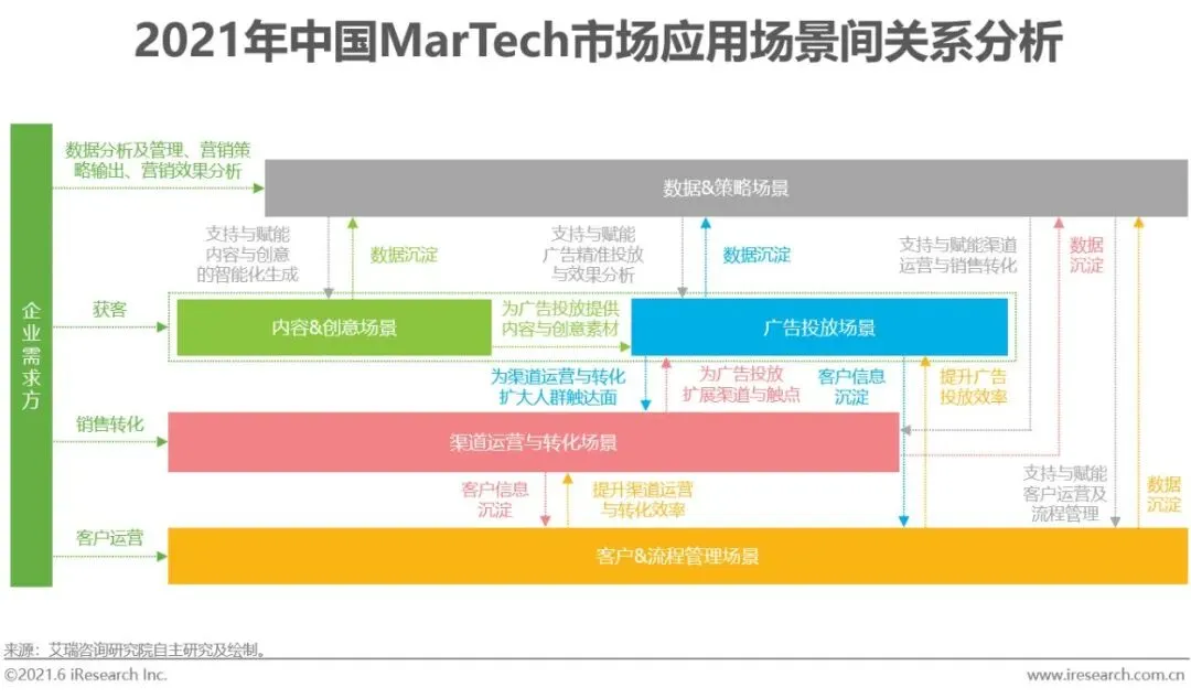 企业需求方的营销理念与思维选择将持续影响着MarTech五大场景的发展动力。广告投放、渠道运营&销售场景对应着用户AIPL模型中的兴趣与购买环节,在其间,兴趣转化和购买转化的ROI具有着较明显的衡量指标,且投入与产出间的链路较短,因而在企业需求方的营销理念更多偏向“投入即产出、产出可衡量”时,该两个场景将具有更大的发展动力。而当企业需求方的营销理念更多偏向长效一体化、动态化,将MarTech各场景看作相互支撑、连通的生态时,不论是广告投放、渠道运营&销售场景,亦或是作为各场景数智化运作基础的数据&策略场景、作为触达用户重要载体的内容&创意场景、作为长期维持用户粘性的客户&流程管理场景,都将具有同样强劲的发展动力。