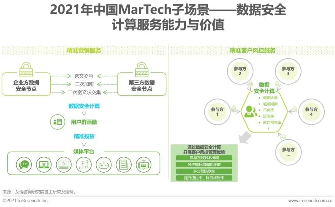 数据安全计算服务的核心价值是:可在参与安全计算的各方数据不出域、不被其他参与方获取数据信息的前提下,进行数据的多方协同计算并产出数据分析结果。数据安全计算服务的出现,能够有效推动因对数据安全和隐私保护要求等级较高,而被迫形成“数据孤岛”的企业联合多方来实现精准营销与精准风控。在国家网信办等政府部门对数据隐私安全保障的关注、宣传以及执法力度的加强推动下,数据安全计算也将成为更多MarTech服务商开展如精准营销、客户风控管理等服务时所需具备的核心能力之一。