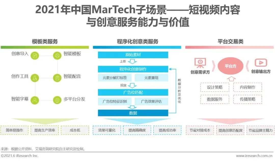 随着我国移动互联网行业的发展,短视频逐渐成为用户重要的信息获取渠道,同时,品牌主对短视频营销的重视度也在不断提高。在短视频用户不断增多的背景下,品牌主需要快速更新短视频内容以吸引用户注意力并抢占用户更多时间,但短视频制作涉及“做策划、写脚本、拍摄视频、剪辑视频、添加字幕和配音”等多个环节,制作流程复杂,其进入门槛也相对较高。而程序化内容与创意服务则通过提供“创意模板、程序化智能内容生成、平台创意交易”等模式,从三方面为企业需求方带来价值:1)帮助提高品牌方和代理商的短视频内容制作效率,形成短视频内容制作的工业化、流程化,在同样成本下,促进更多素材内容的生产;2)追踪和分析营销数据,实现广告效果可归因,提高营销精准度;3)在未来或有可能串联起品牌主的供应链管理等其他业务,从而助力品牌主建立全链路数字营销。