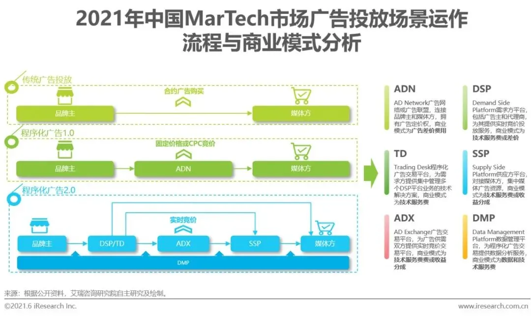 广告投放场景下的技术应用主要体现于程序化广告。传统广告投放是媒体方和品牌主之间通过合约广告购买的方式来完成交易,其间存在着交易低效等多种问题。随着互联网PC时代的到来,互联网技术和新媒介的发展带来了程序化广告的1.0时代,ADN成为对接媒体方和品牌主的新方式,在该模式下,中长尾部流量通过集中交易,有效提高供需双方对接效率。近些年广告载体迎来PC屏、手机移动屏、户外屏、OTT屏等并存的“多屏时代”,广告载体的变化使得广告投放环境愈加多元而分散,故程序化广告也在不断革新,并带来了以SSP、ADX、DSP、TD、DMP等为核心运作生态的程序化广告2.0时代。虽然近年来头部媒体逐渐形成广告交易的自循环,但大部分头部媒体依然会通过接入上述程序化交易平台完成流量的分级销售,品牌主也通过程序化交易平台精细化管理广告投放业务。