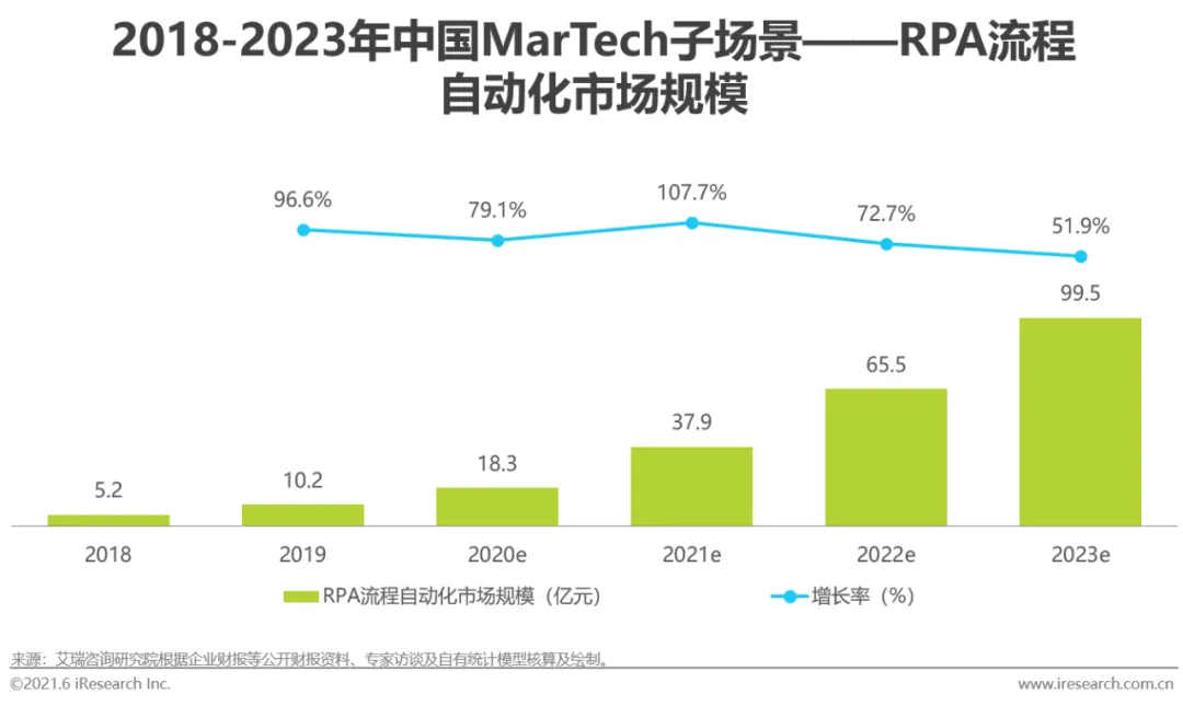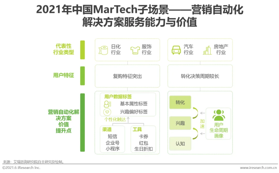 营销自动化能够结合多场景,形成以自动化手段帮助企业洞察与运营用户生命周期,并最终促进用户价值提升的解决方案,其与SCRM等的结合是当前市场中较为主流的应用方向。营销自动化解决方案能够为两类企业带来尤为显著的价值,(1)第一类为以零售业态为代表的产品复购属性突出的企业,营销自动化解决方案基于对用户偏好的洞察,为其在不同时期与渠道下推送个性化内容,加强用户粘性、提升复购频率;(2)第二类为以汽车、房地产行业为代表的用户购买决策周期较长的企业,营销自动化解决方案帮助企业汇集用户生命周期数据与深度洞察用户需求,提升用户在每个决策环节间的转化效率,并最终促成购买转化。营销自动化解决方案推动企业从数字化向自动化营销阶段迈进,2020年,营销自动化解决方案市场规模为15.2亿,随着企业对营销自动化技术认知度的不断提升,服务商也将拥有更大的变现空间。