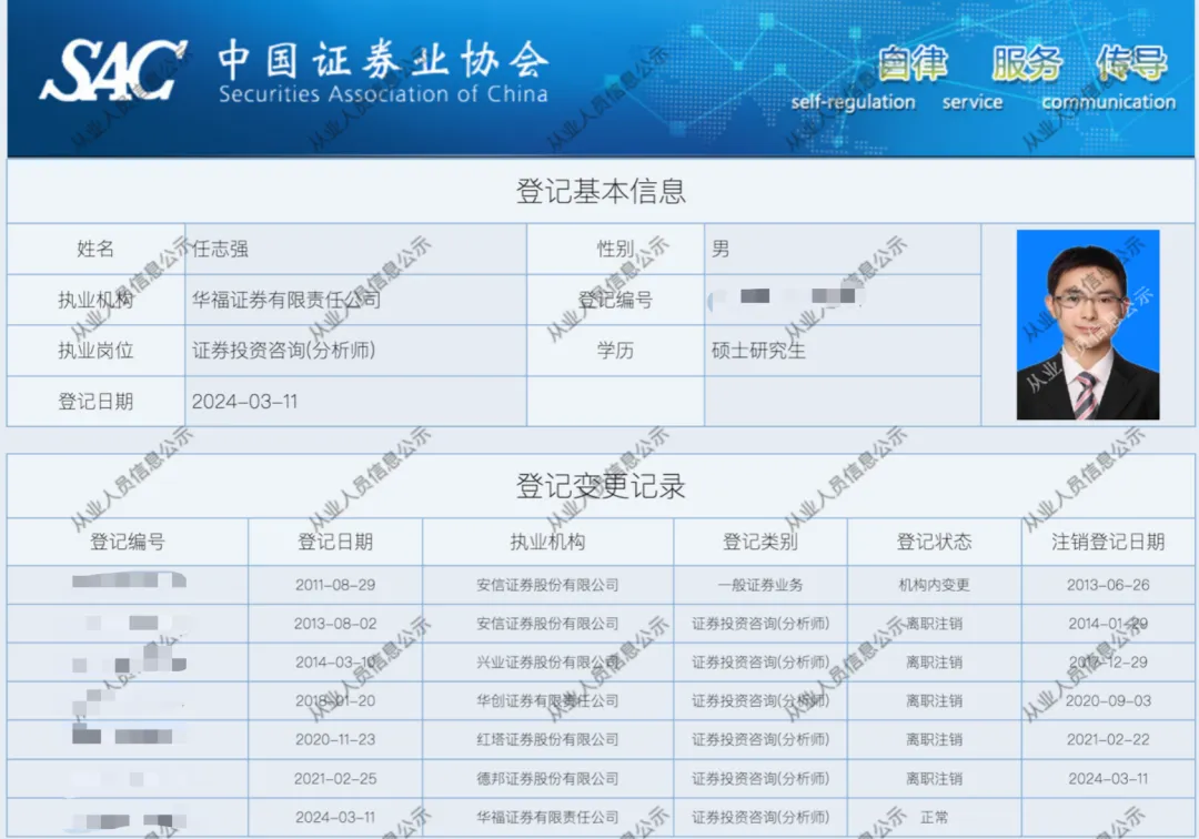 中证协的官网信息显示,任志强已经在3月11日完成了登记变更,工作单位由德邦证券变为华福证券。