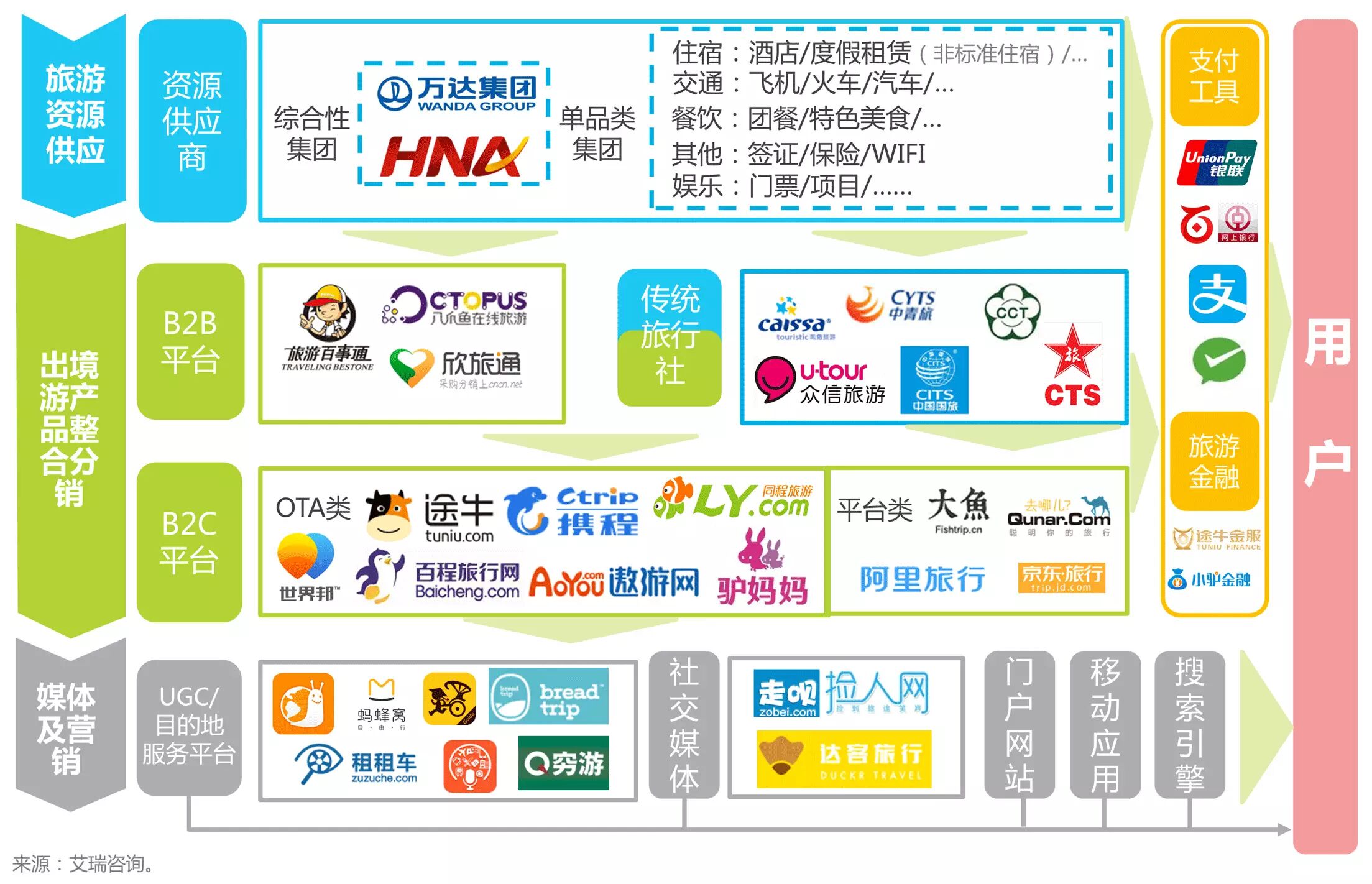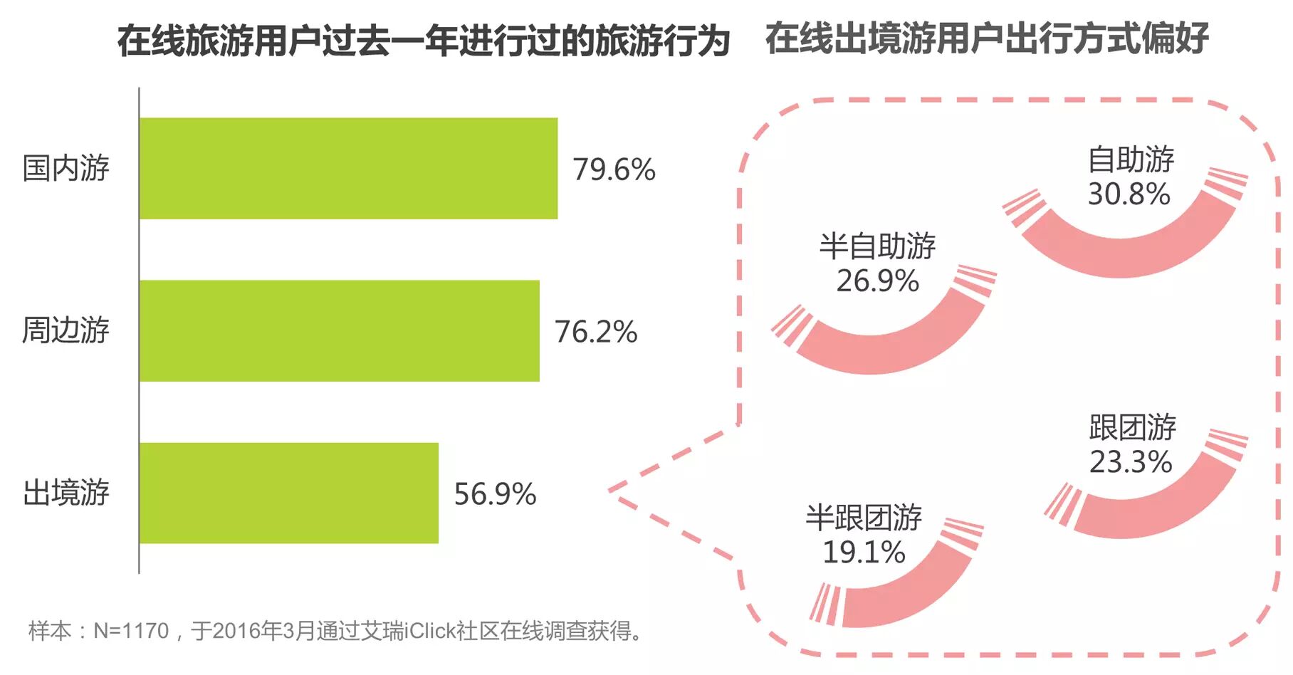 国家旅游局数据显示,2015年我国出境游人次达1.2亿。艾瑞用户调研数据表明,在过去一年中有过在线出境游行为的用户达56.9%。出境游用户当中以自助游方式出游的用户达30.8%,纯跟团游用户仅占23.3%,半自助游和半跟团游用户分别占26.9%、19.1%,艾瑞分析认为,旅行社可以帮助用户办理出境游手续等减轻用户行前压力,并且可以在目的地协助游客解决问题、规避风险等,因此旅行社对于无法完全自助游方式出行的用户有着存在的必要性。