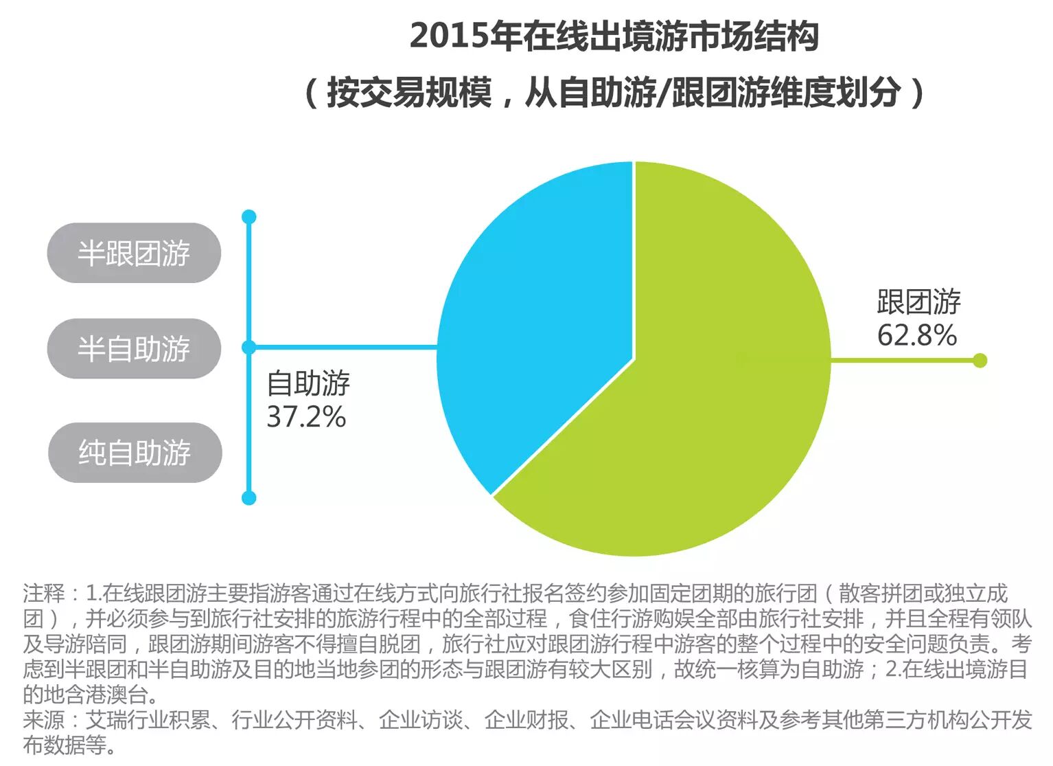 艾瑞监测数据显示,2015年在线出境跟团游交易规模占比62.8%,在线自助游交易规模占比37.2%。在线自助游按照出游形式可进一步划分为纯自助游、半跟团游、半自助游。艾瑞分析认为,自助游中除了“机+酒”的标准化产品外,一些以机酒产品为核心的多样化产品动态打包的服务模式将成为未来自助游的重要形式。