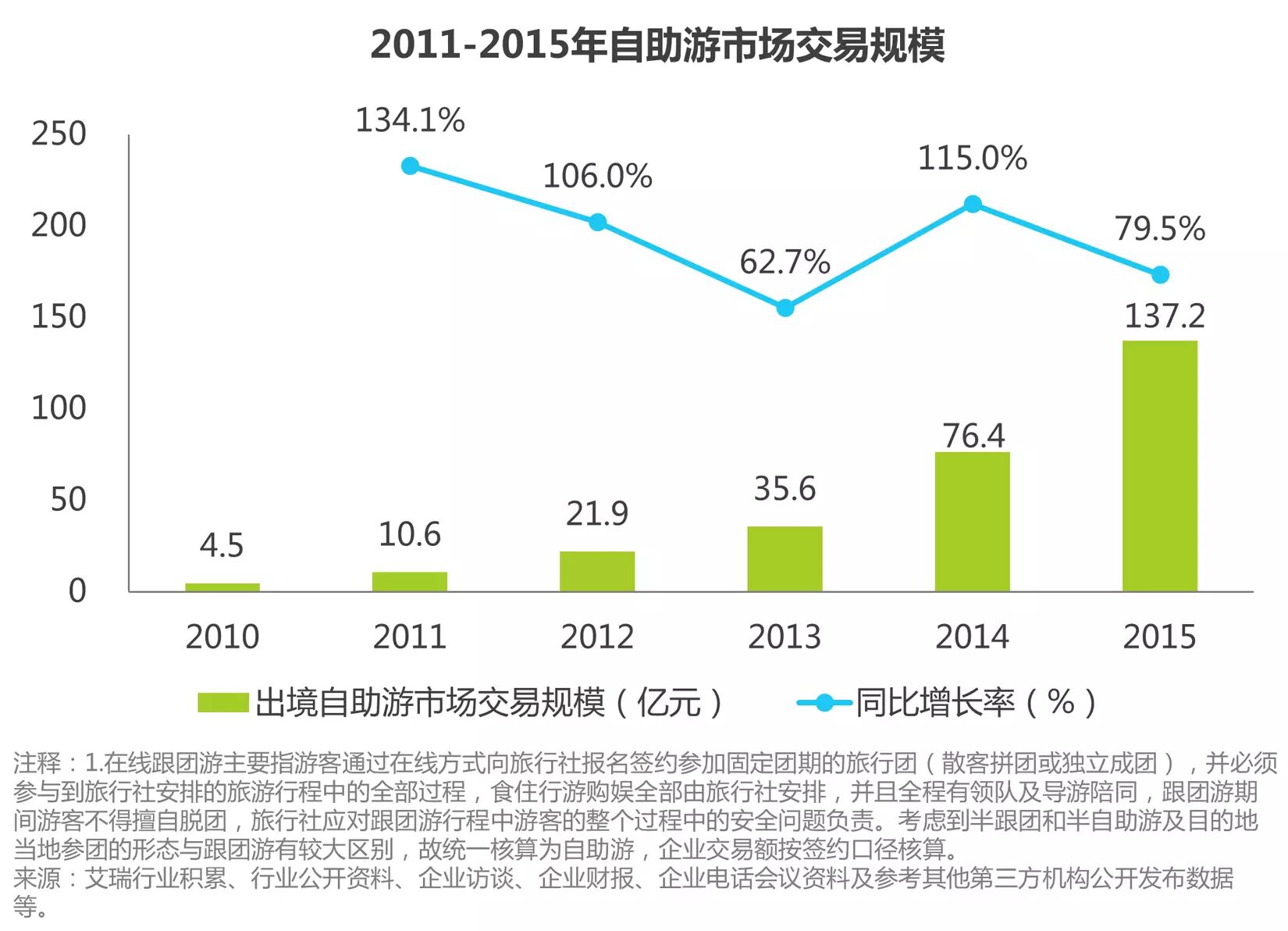 2015年出境自助游市场交易规模达137.2亿元,同比增长79.5%。艾瑞分析认为,随着出境游目的地服务越来越完善,有多次出境游经历或追求个性化体验的用户越来越偏向自助游方式,自己制定行程计划,能够使行程更加符合个人期待,提升出游体验满意度。