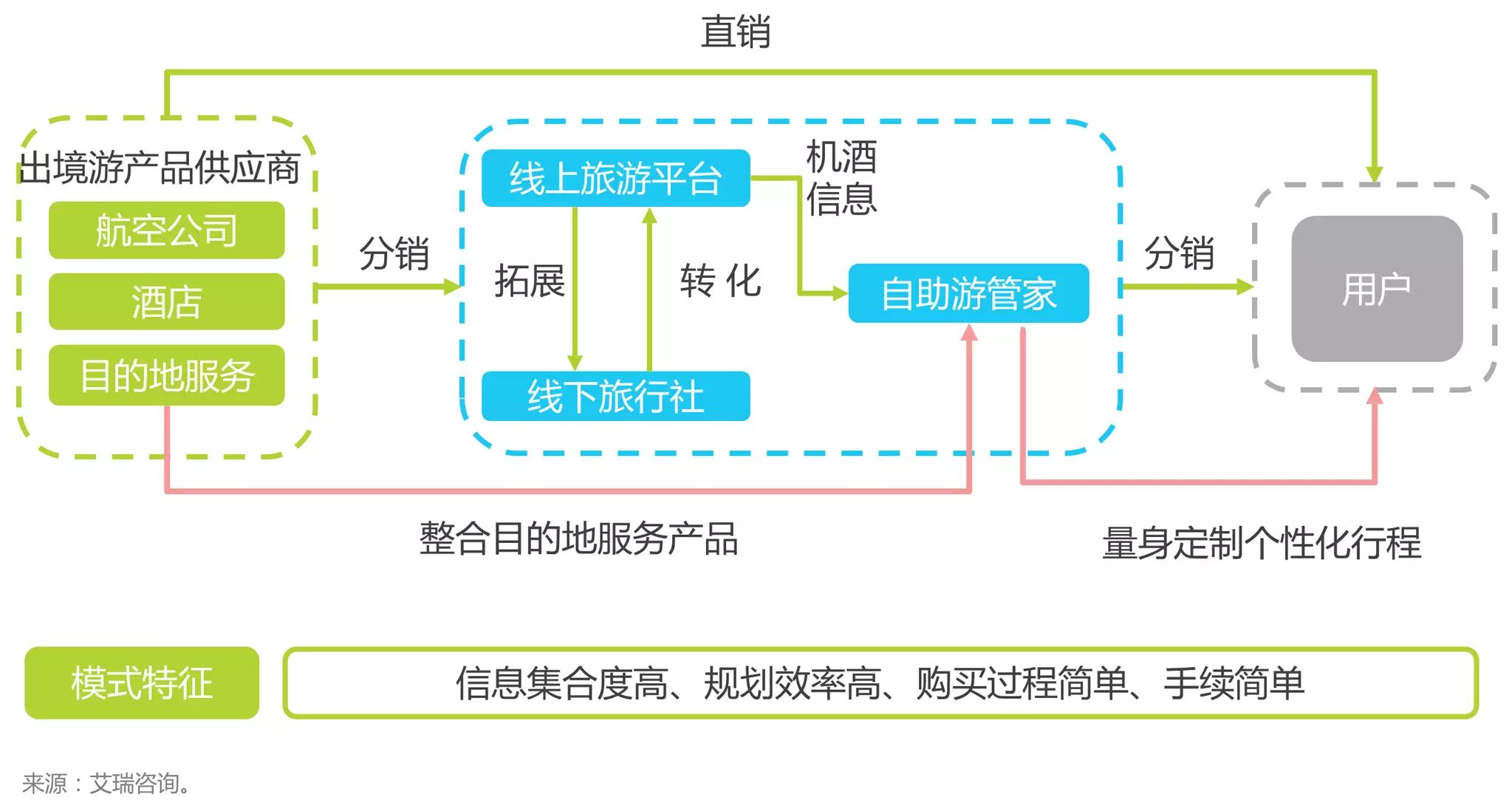 新型服务模式的出境自助游引入大量目的地服务产品,用户选择机票和酒店信息后,自助游管家会整合碎片化的目的地服务产品信息推送到用户端,由用户自由搭配选择,大大提升用户出行前的体验,从而带动出境自助游产品及其相关产业的迅速发展。