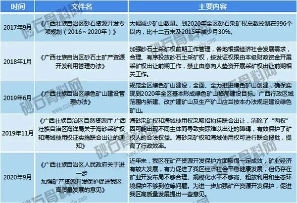 近年来,广西对砂石骨料矿山及河道采砂的管控日渐收紧。2017年5月,广西宣布要在2020年内将采石场控制在1150个以内;同年10月底,广西再次对砂石采矿权进行了限制,要求在2020年全区砂石场总数必须控制在996个以内。不仅如此,广西还划定了14处建筑用砂石重点开采区和20处水泥用灰岩重点开采区;最后还对开采量进行了约束,到 2020年开采总量预期为3.55亿吨,其中建筑用砂石2亿吨,水泥用灰岩1.55亿吨。