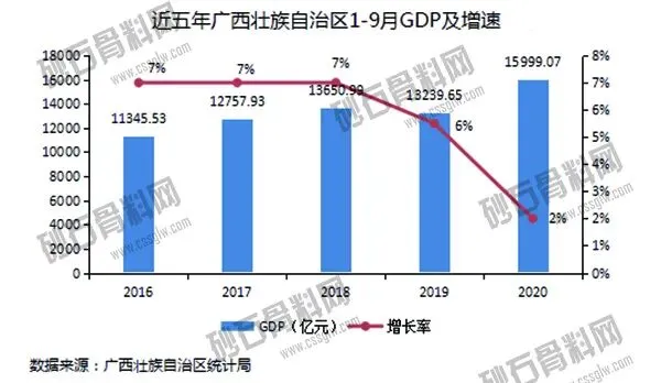 来自广西壮族自治区统计局的数据显示,2016年1-9月,广西壮族自治区经济生产总值首次突破1万亿元大关,2016-2018年,广西地区生产总值的同比增速均快于全国增速,至2020年1-9月,广西壮族自治区经济生产总值为15999.07亿元,较去年同期同比增长2%,增速比上半年加快1.2个百分点(由于调整后的2018年前三季度广西地区生产总值数据未披露,因此2018年前三季度与2019年前三季度的数据不具有可比性)。受疫情影响,2020 年一季度广西经济增长增速同比下降3.3%,但二季度广西经济运行延续加快恢复态势。