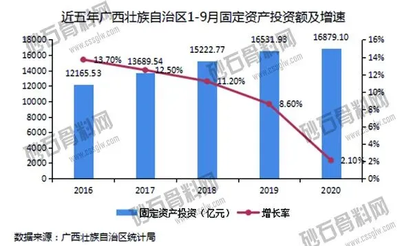 来自广西壮族自治区统计局的数据显示,2020年1-9月,广西壮族自治区的固定资产投资金额(不含农户)为16879.10亿元,较去年同期同比增长2.1%,增速比上半年加快1.0个百分点。数据显示,广西地区近五年来1-9月固定资产投资额增速一直处于下降趋势。受疫情影响,广西一季度固定资产投资(不含农户)同比下降7.9%。随着新冠疫情影响因素的逐渐减弱,今年三、四季度的固定资产投资强度持续加大,前三季度固定资产投资已高于 2019年同期水平。今年上半年,广西全区固定资产投资(不含农户)与同期同比增长1.1%,由一季度的下降7.9%转为正增长。