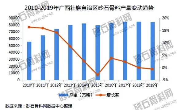 据砂石骨料网统计,2010-2012年,广西砂石骨料产量一直保持二位数的增长幅度,产量也由2010年的约5.6亿吨增至7.4亿吨。自2013年起,广西砂石产量增速持续减缓, 2015 年更是首次出现负增长。数据显示,近年来当地砂石产量浮动较小,到2019年产量达到 84229万吨。