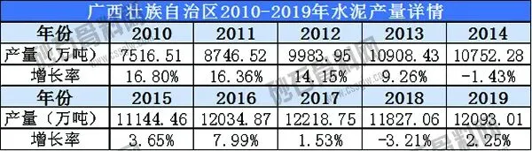 据国家统计局统计数据显示,2010-2013年,广西水泥产量持续增长,年产量由2010年的7516.51万吨增至2013年的近10908.43 万吨。2014年,该地区水泥产量增速出现小幅下降,但2015年其水泥产量增速开始回暖,2019年,当地水泥产量达到12093.01万吨。