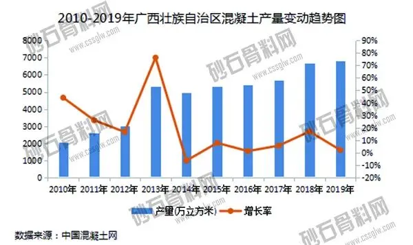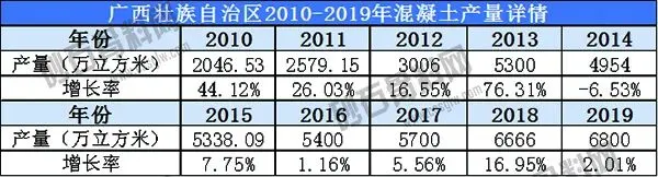 据中国混凝土网统计,2010-2013年,广地区混凝土产量复合增长率均保持着2位数及以上的水平,在2014年,出现十年来首次负增长,混凝土产量降至5000万方以下。2015 年起,广西混凝土产量增速有所回暖,但增速仍保持在个位数;2018年,混凝土产量再次大幅度上升,2019年,混凝土产量基本与2018年持平,产量为6800万方。