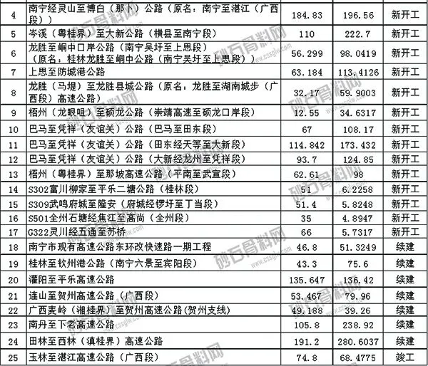 本次统计的2020年广西主要在建和拟在建高速公路项目共62个,里程总数约5005.051 公里。据估算,这些项目需要砂石约2.85亿吨。