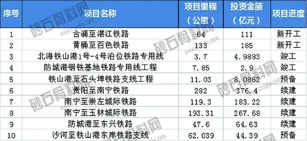 本次统计的2020年广西即将竣工、在建和拟在建铁路项目共10个,铁路里程总计 923.829公里。据估算,这些项目总计需要砂石约1.39亿吨。