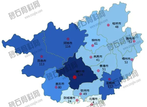据砂石骨料网的不完全统计,截止到2020年初,广西共有各类砂石矿山929家,目前广西建筑砂石企业主要集中在广西西北部地区。在统计的929家建筑砂石企业中,南宁市有124家,占统计矿企总数量的13.35%。除了南宁市,河池、百色和玉林等地区的砂石企业也较多。