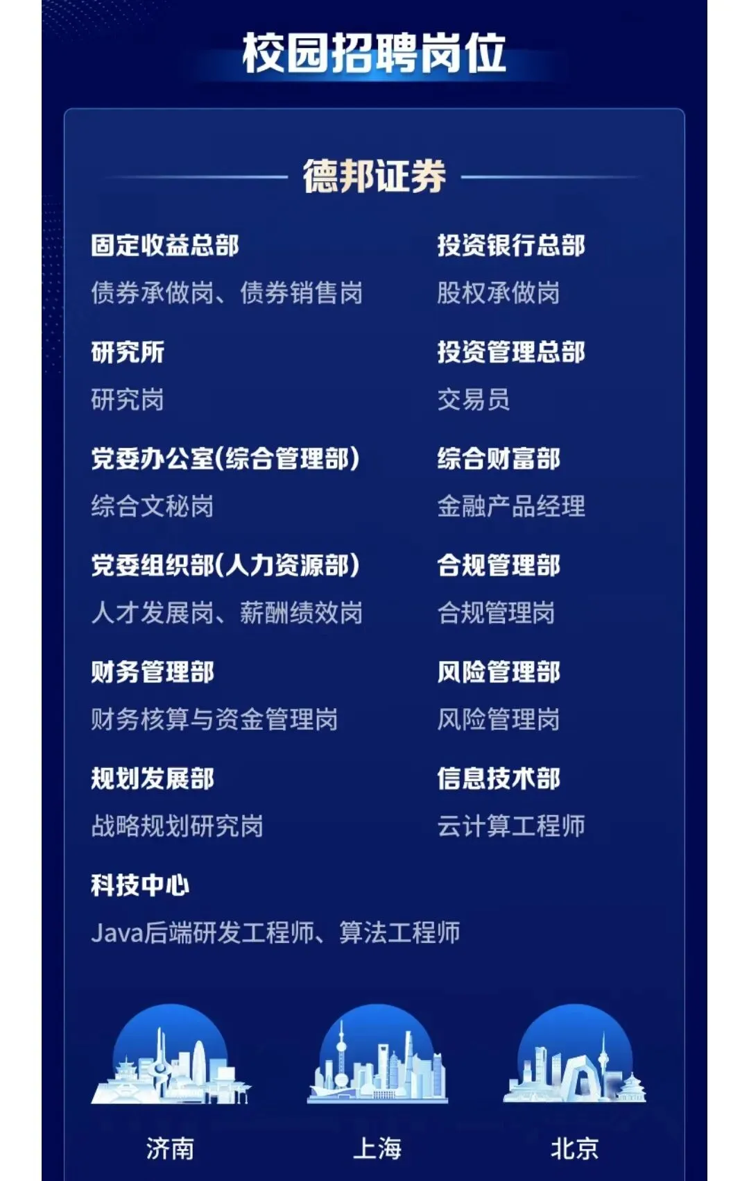 另据德邦证券招聘平台信息,德邦证券2026年度校园招聘工作已启动,在济南、上海、北京均有重点布局。