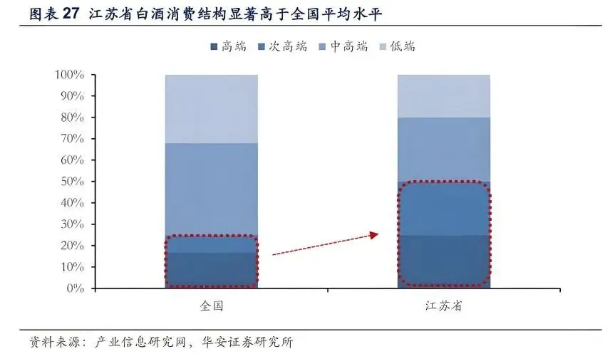 华安证券研报显示,江苏省内高端/次高端/中端/低端白酒占比为20%/22%/40%/18%,300元以上价格带占比接近一半,100元以上价格带占比超80%。对比全国高端/次高端/中端/低端白酒结构占比分别为19%/10%/33%/38%,江苏白酒消费结构呈“橄榄型”,相对更加合理。