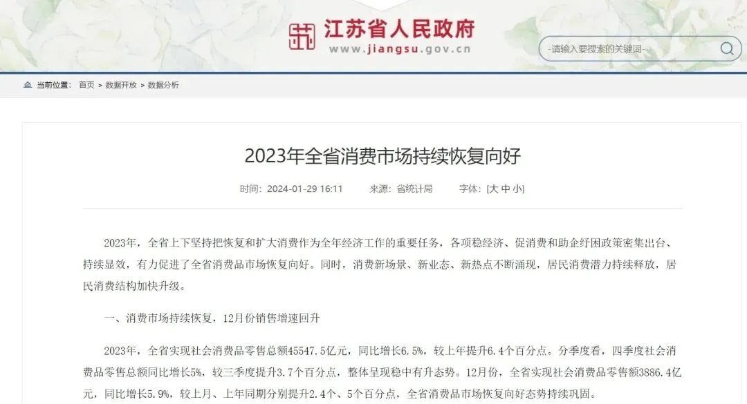 雄厚的经济实力成为消费的基础,江苏能赚也能花。2023年,江苏社会消费品零售总额45547.5亿元,比上年增长6.5%,占全国社会消费品零售额比例达至9.7%。