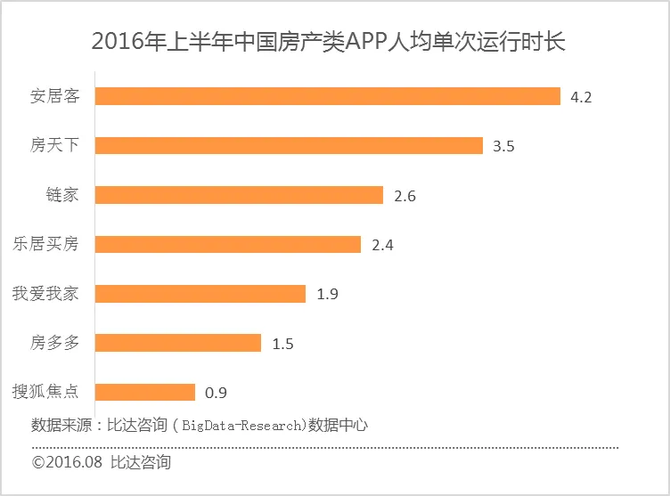 APP运行时长,安居客人均单次运行时长为4.2分钟,排名第一;其次是房天下,为3.5分钟;链家、乐居买房、我爱我家、房多多和搜狐焦点分别为2.6分钟、2.4分钟、1.9分钟、1.5分钟和0.9分钟。
